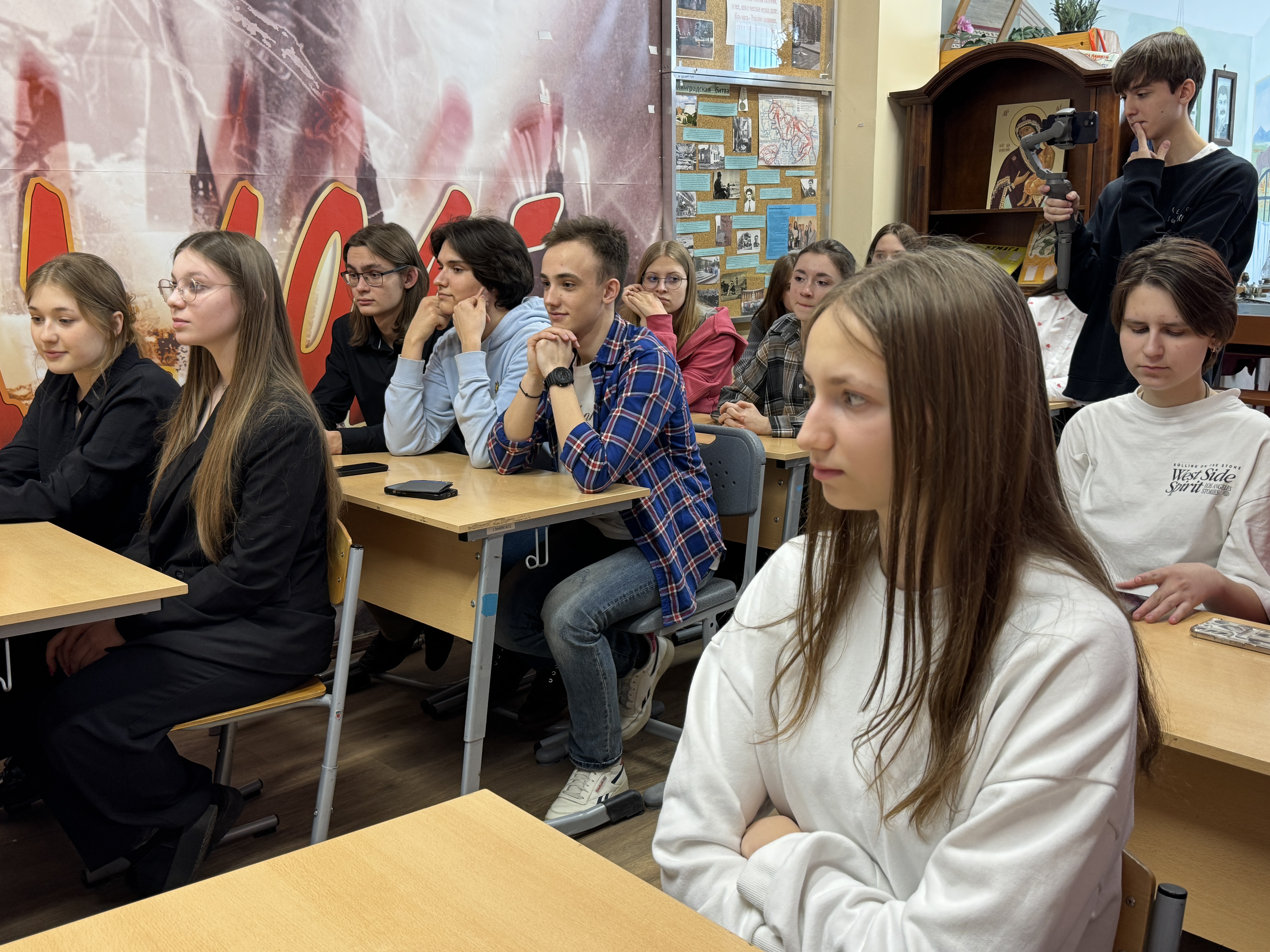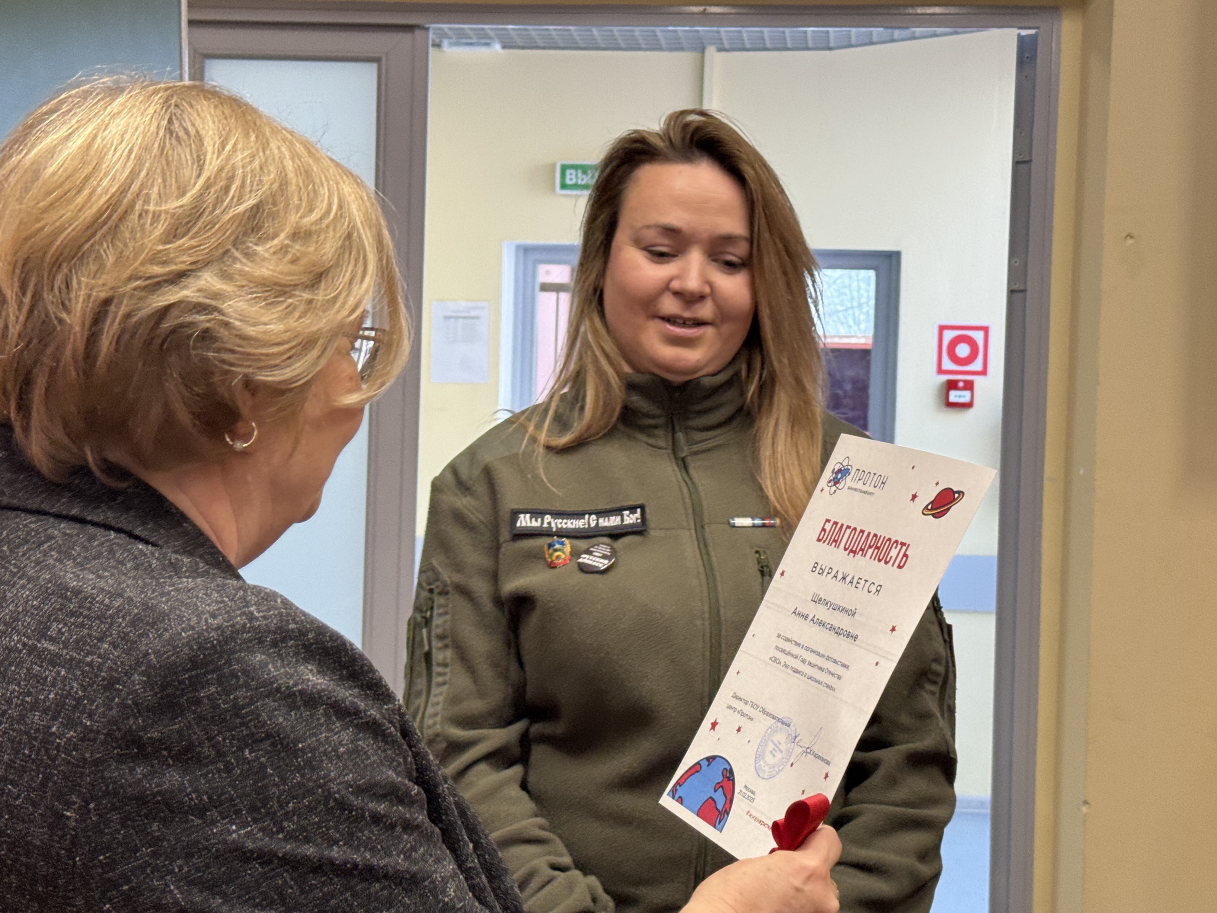 На торжественном мероприятии, организованном совместно с добровольческим отрядом "РусскийДонбасс" присутвовали кадеты и мелиаклассники. После открытия и знакомства с выставкой Артем провел круглый стол для медиаклассников. Артем рассказал, как:Находить "говорящие" детали, передавать эмоции через композицию, работать с цветом и светом в полевых условиях и о том, как важно передавать искренние эмоции и атмосферу. Протоновцы узнали: как защитить камеру от песка и влаги, какие 3 предмета всегда в рюкзаке военкора, почему штатив может спасти жизнь.